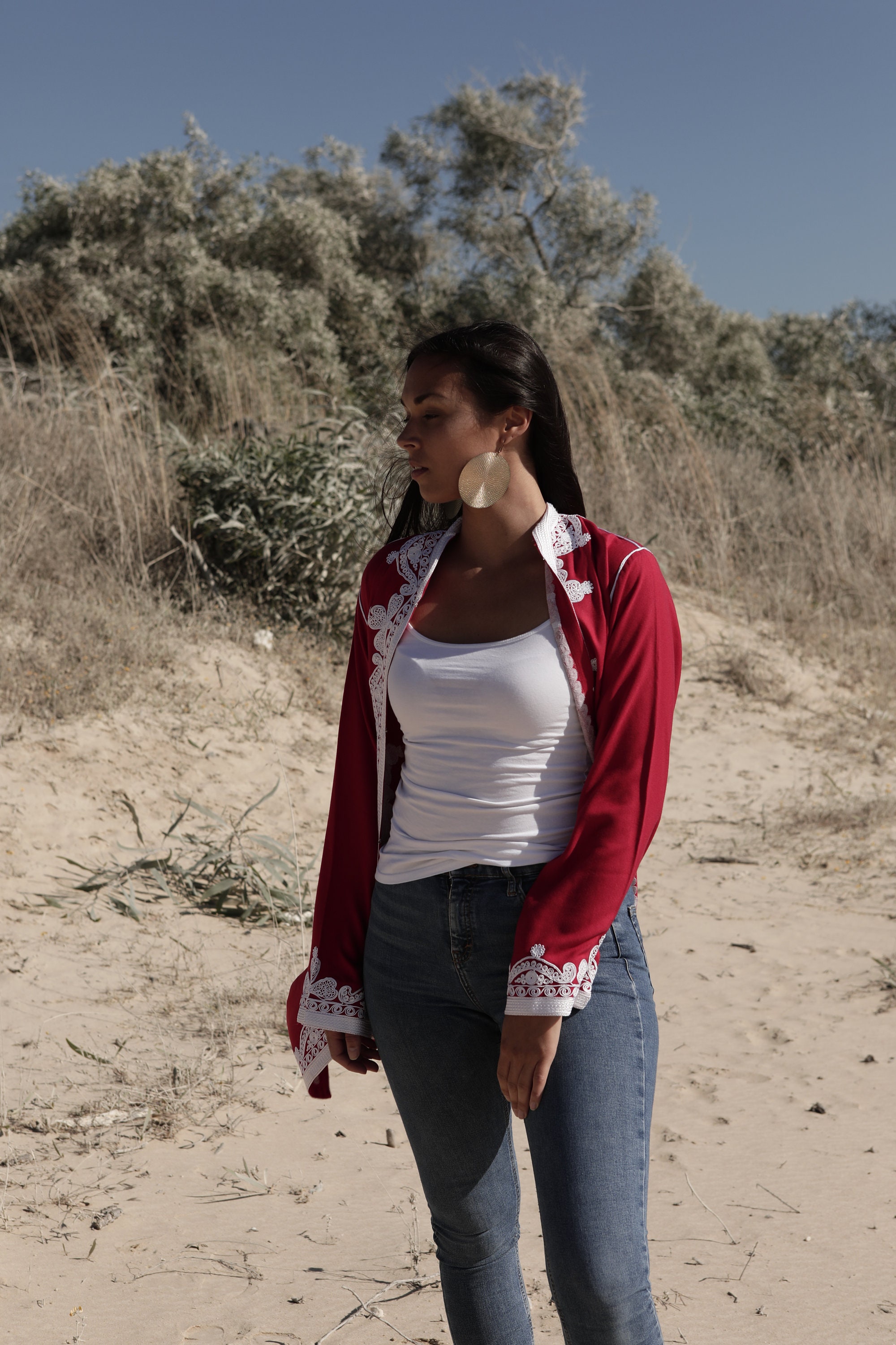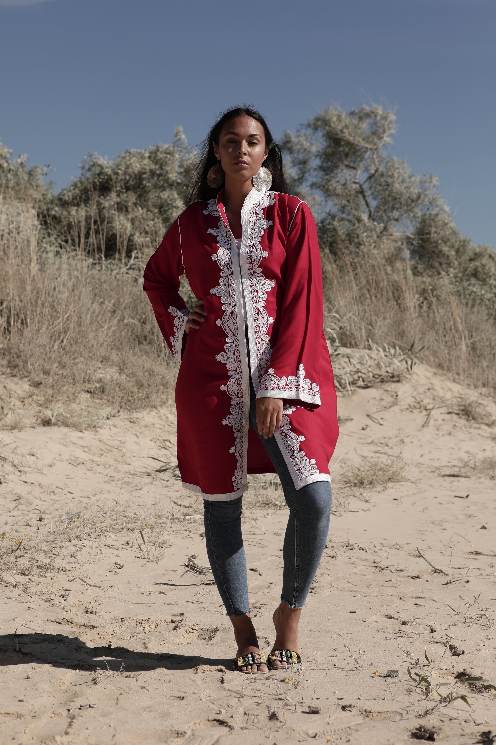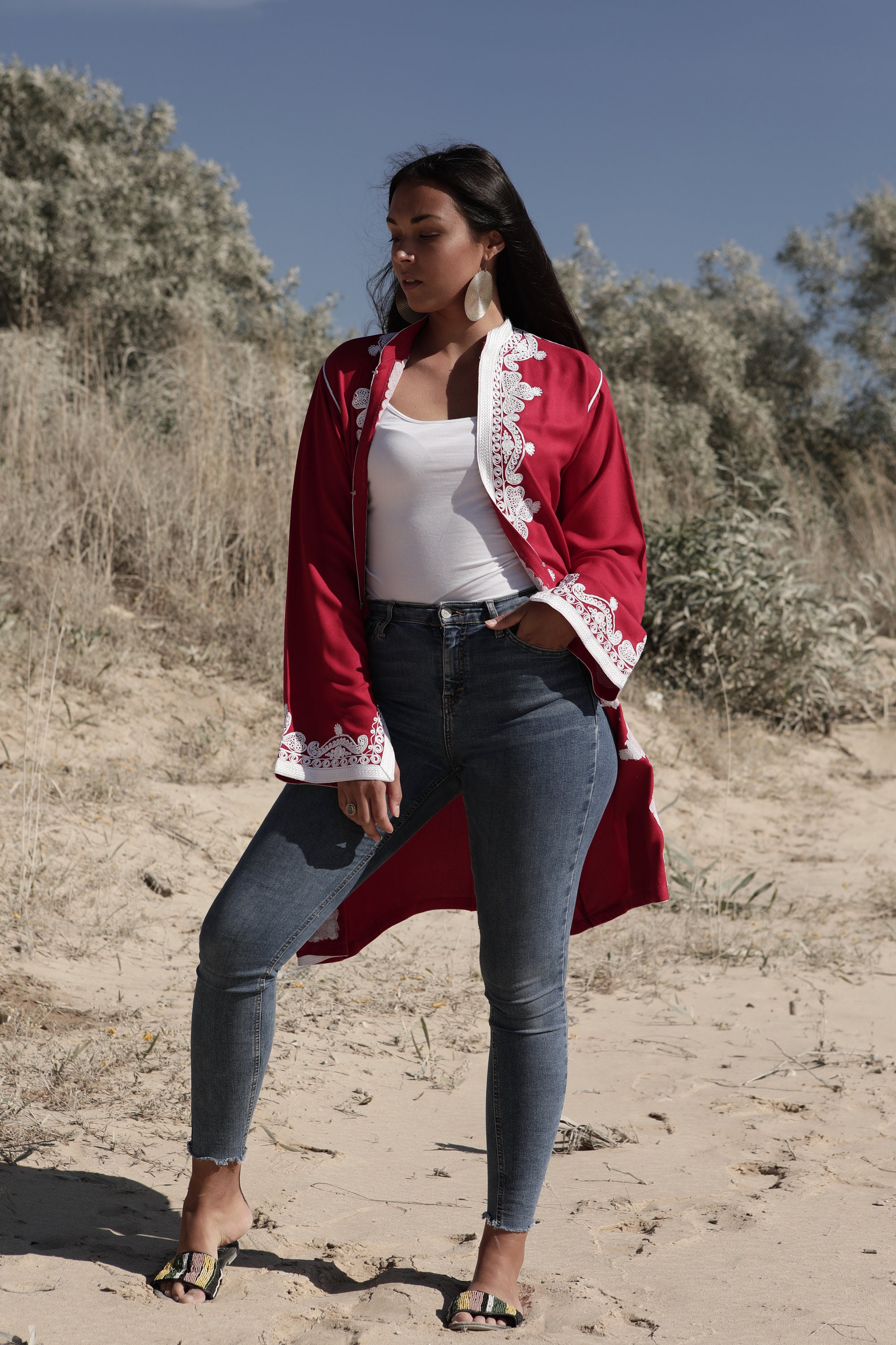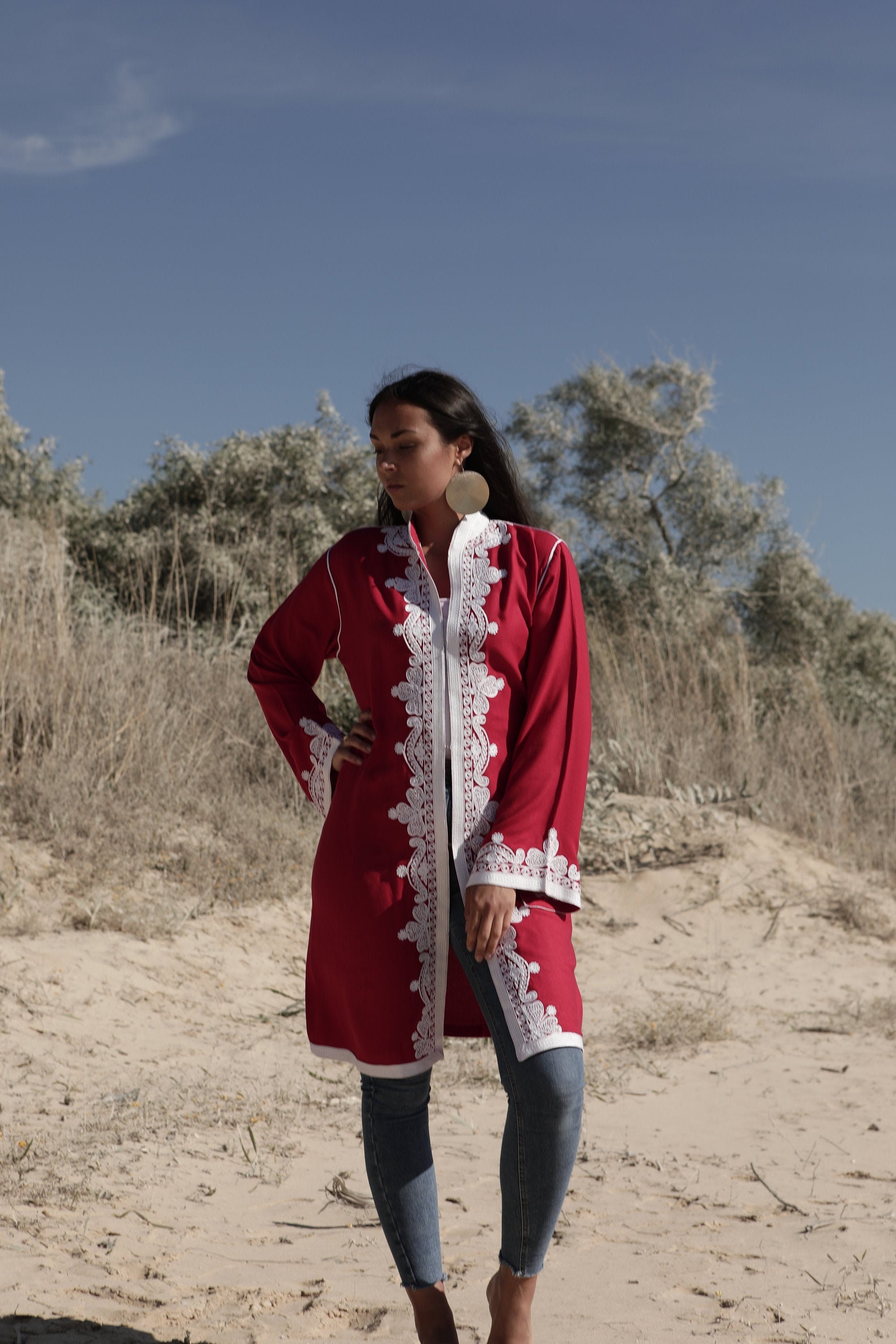 Made from cotton ( there is no lining inside ) with beautiful Moroccan embroidery this Jacket can be worn open, as a kimono, or closed as a tunic jacket.